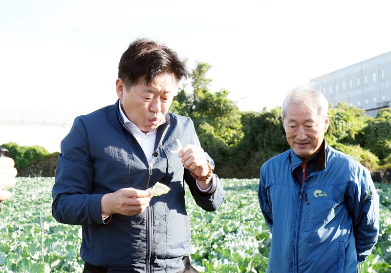 오 지사는 특히 신엄리 양배추 재배 농가에서는 작황을 점검하고 농업 현장의 애로사항에 귀를 기울였다.
