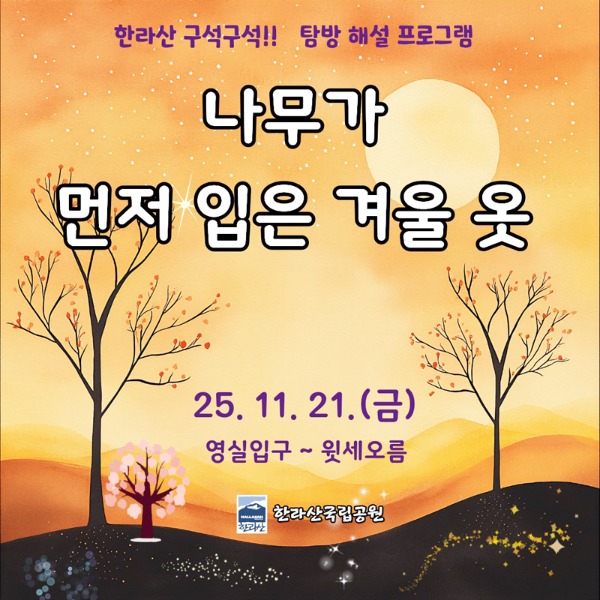 고종석 제주도 세계유산본부장은 “한라산 영실은 가을, 겨울 풍광이 빼어나 많은 이들이 찾는 곳”이라며 “이번 프로그램을 통해 겨울나무의 생명 순환과 자연의 지혜를 느끼는 시간이 되길 바란다”고 말했다.