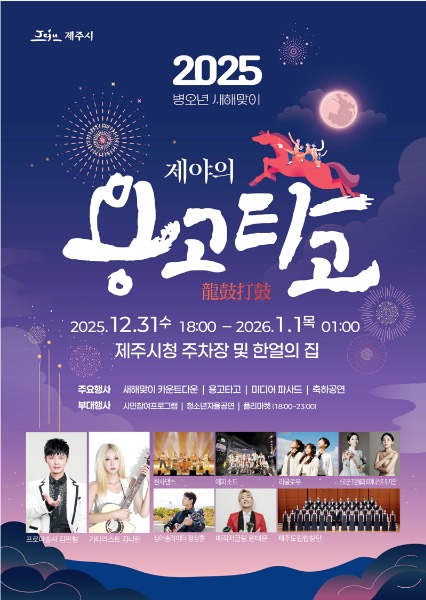 제주시가 2025년을 마무리하고 2026년 병오년(丙午年) 붉은 말의 해를 맞아, 제주시민의 무사 안녕을 기원하는 ‘제야의 용고타고’ 행사를 오는 31일 밤 10시 제주시청에서 개최한다.