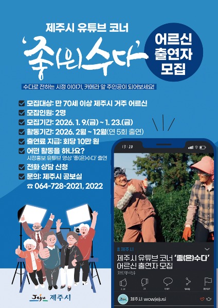 제주시가 올해 새롭게 노년층 대상 유튜브 코너 ‘좋(은)수다’를 신설하고, 프로그램에 출연할 ‘어르신 배우’ 2명을 공개 모집한다.