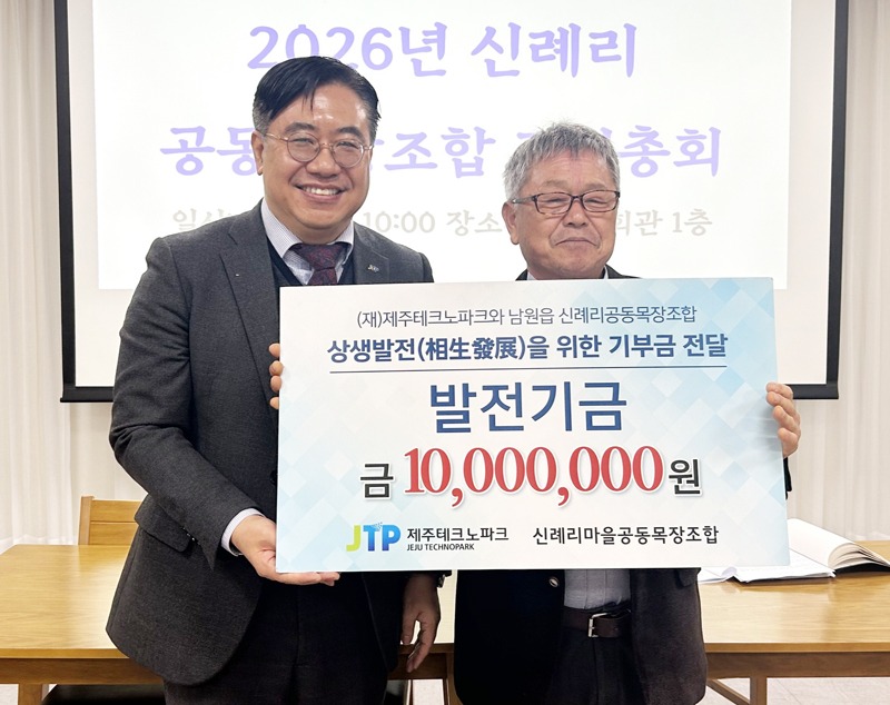 제주테크노파크 청정바이오사업본부 생물종다양성연구소는 25일 서귀포시 남원읍 신례1리 다목적회관에서 신례리공동목장조합에 발전기금 1천만 원을 전달했다.