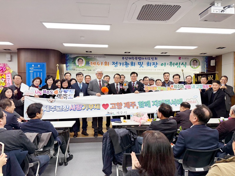 제주시가 지난 28일 부산제주도민회관에서 열린 ‘제37대 부산제주특별자치도민회 회장 이·취임식’ 현장에서 고향사랑기부제 지정기부사업 홍보 캠페인을 진행했다.