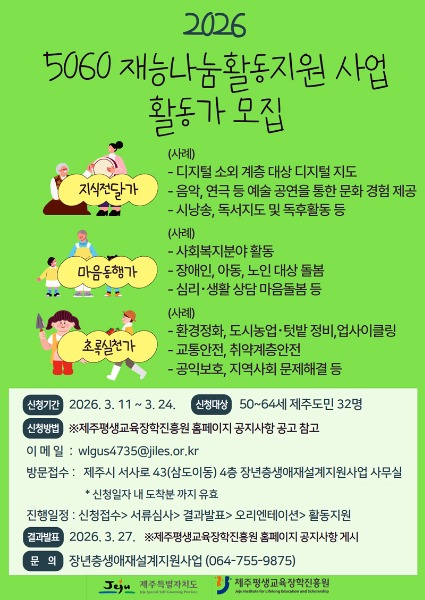 (재)제주평생교육장학진흥원(원장 진희종)이 제주도민 50~64세 대상으로 ‘5060재능나눔 활동가’를 모집한다.