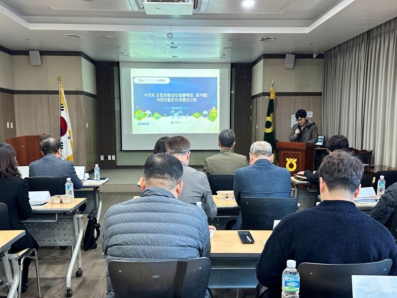 제주 서귀포시가 지난 19일 서귀포시축협 축산물플라자 세미나실에서 국립공원연구원 연구진, 지역 주민 등 20여 명이 참석한 가운데 ‘서귀포시 도립공원(성산일출해양, 제주곶자왈) 자연자원조사 최종보고회’를 갖고, 지난 1년간의 조사 성과와 향후 관리 방안을 공유했다.