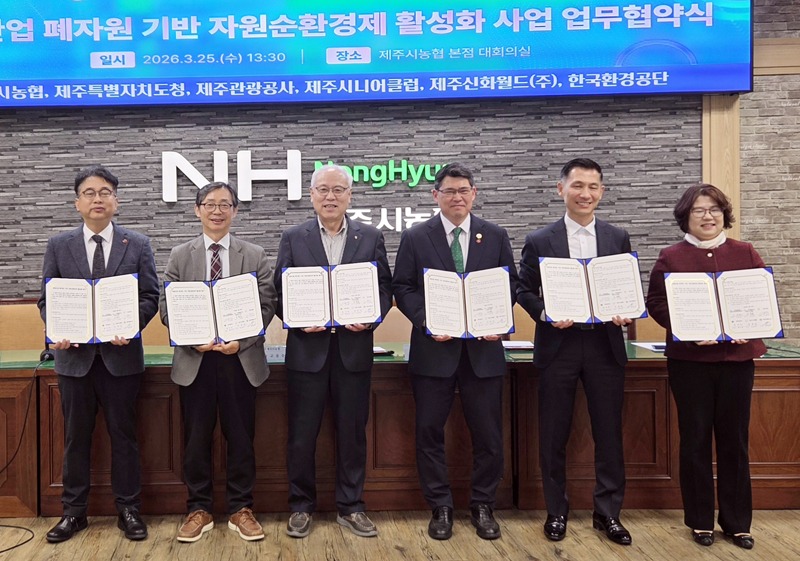 제주도는 25일 제주시 농협에서 한국환경공단, 제주관광공사, 제주시농협, 제주 시니어클럽, 제주신화월드와 ‘관광산업 폐자원 기반 자원순환경제 활성화’를 위한 업무협약을 체결했다.