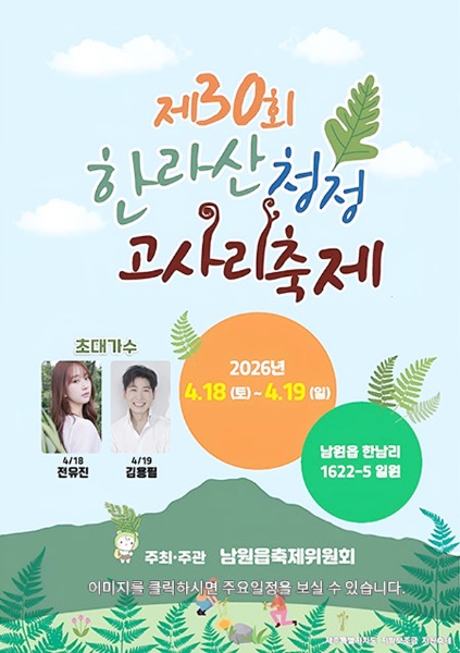 제주 서귀포시 남원읍이 오는 18일과 19일 이틀간, 한남리 일원에서 제주의 봄을 대표하는 ‘제30회 한라산 청정 고사리 축제’를 개최한다.