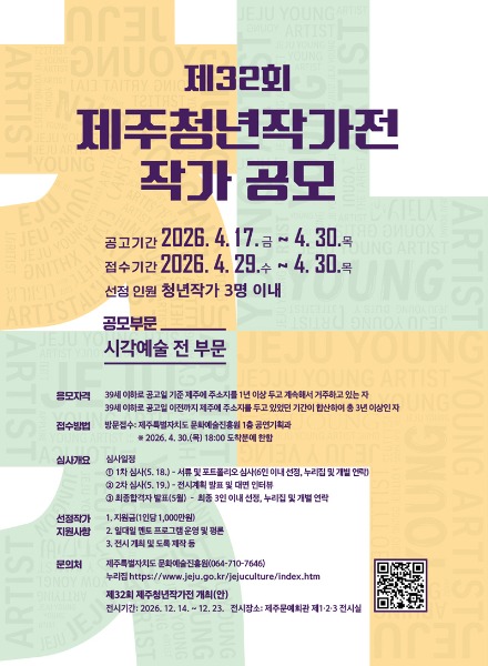 제주도 문화예술진흥원이 ‘제32회 제주청년작가전’에 참여할 청년작가를 공모한다.