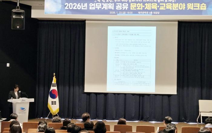 제주도가 지속 가능한 제주 문화가치를 육성하기 위해 23일 오후, 제주문학관 대강당에서 문화·체육·교육분야 워크숍을 성황리 개최했다.‘ᄆᆞᆫ딱 힘 모앙, 우리 제주 문화가치 지꺼지게 높여 보게양!’이라는 표어 아래 열린 이번 워크숍에는 관계자 150여 명이 참석했는데