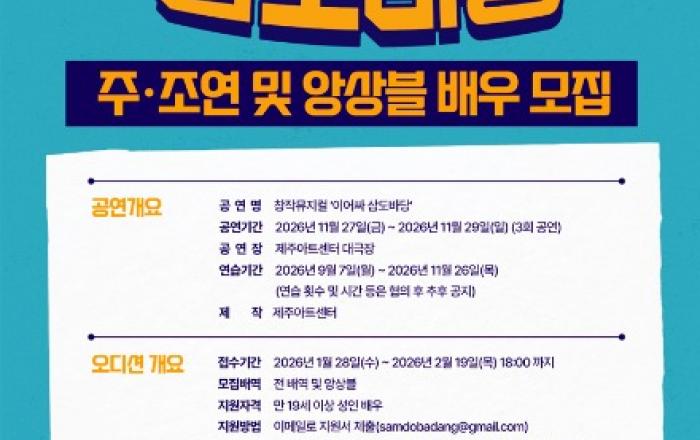 제주아트센터가 올해 11월 개최 예정인 창작뮤지컬 ‘이어싸 삼도바당’에 참여할 배우를 모집하고, 공연 오디션을 진행한다.이번 모집은 주·조연 및 앙상블 배우를 선정하는 것으로 구체적인 배역은 오디션을 통해 확정한다.▲ 제주아트센터의 창작뮤지컬 ‘이어싸 삼도바당