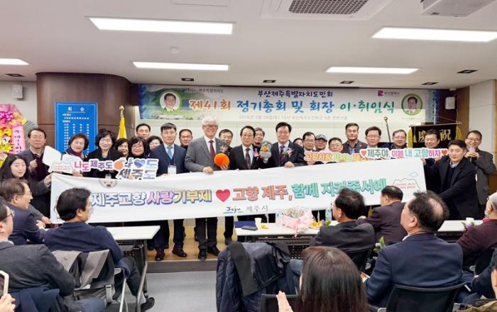 제주시가 지난 28일 부산제주도민회관에서 열린 ‘제37대 부산제주특별자치도민회 회장 이·취임식’ 현장에서 고향사랑기부제 지정기부사업 홍보 캠페인을 진행했다.이날 캠페인은 부산에 거주하는 재외도민들이 한자리에 모인 자리를 계기로 고향사랑의 의미를 확산하기 위해 마련됐다.