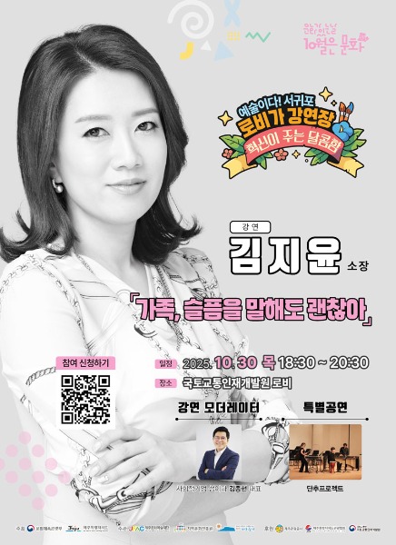 강연 프로그램인 ‘로비가 강연장’의 일환으로 오는 30일 국토교통인재개발원에서 USTORY연구소 김지윤 소장의 강연을 마지막으로 준비했다. ‘가족, 슬픔을 말해도 괜찮아’를 주제로, 가장 가깝기에 어려운 가족 간의 소통에 대한 강연으로 현대 가족이 처한 고민의 답을 제시한다.