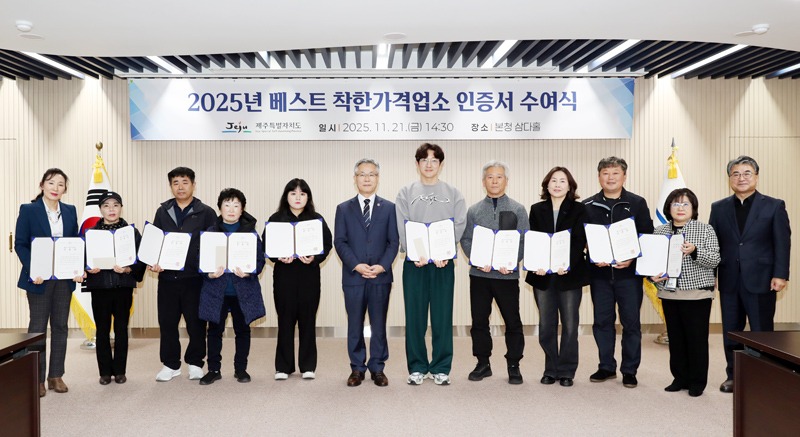 제주도가 도내 최초로 ‘2025년 베스트 착한가격업소’ 15개소를 선정하고 지난 21일 인증서 수여식을 개최했다.