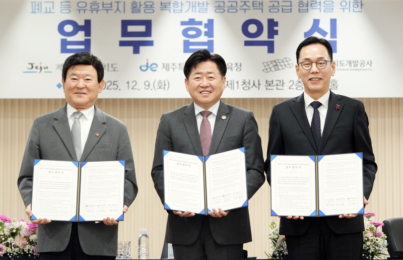제주특별자치도와 제주도교육청, 제주도개발공사는 9일 도청 삼다홀에서 폐교 등 유휴부지 활용 복합개발 공공주택 공급 협력을 위한 업무협약을 체결했다.