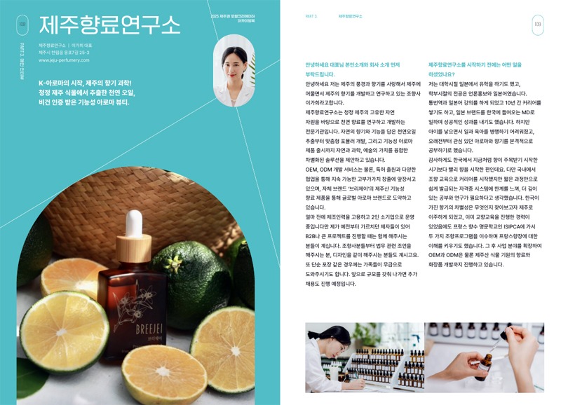 세 번째 분야는 콘텐츠·연구 중심으로 제주의 가치를 기술과 기획, 콘텐츠로 확장한 9개 팀의 이야기를 소개하는데 ▲제주 자생 식물을 연구해 향료를 개발하는 ‘제주향료연구소’ ▲지역 청년을 연결하는 일자리·커뮤니티 플랫폼 ‘잇지제주’ ▲제주 무속 문화를 디지털 기술로 재해석한 ‘주식회사 인스피어’ 등 지역 문화와 산업의 새로운 가능성을 보여주는 사례들이 포함됐다.