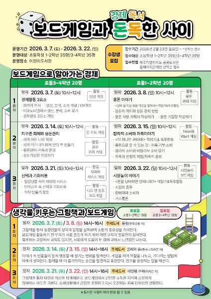 이 프로그램은 3월 7일부터 22일까지 어린이도서관에서 ▲보드게임으로 알아가는 경제 ▲생각을 키우는 그림책과 보드게임 등 2개 과정으로 진행된다.