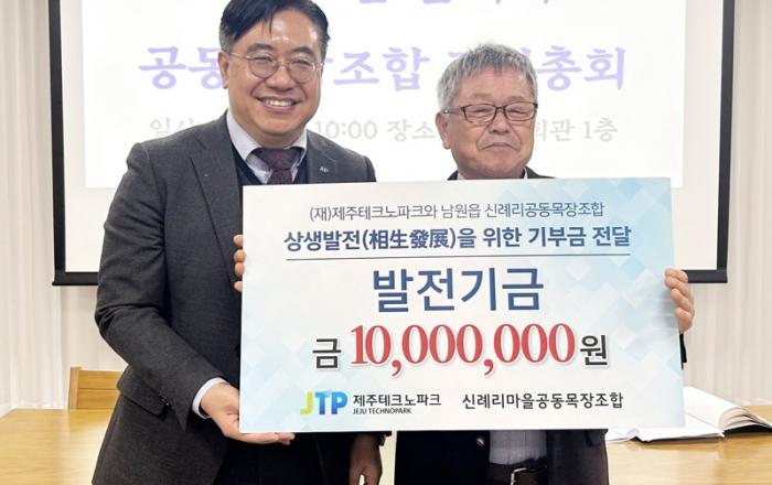 제주테크노파크 청정바이오사업본부 생물종다양성연구소는 25일 서귀포시 남원읍 신례1리 다목적회관에서 신례리공동목장조합에 발전기금 1천만 원을 전달했다.