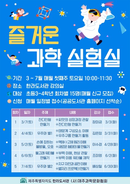 제주 한라도서관이 오는 3월부터 7월까지 매월 첫째 주 토요일 초등학생을 대상으로 기초과학 체험 프로그램 ‘즐거운 과학 실험실’을 운영한다.