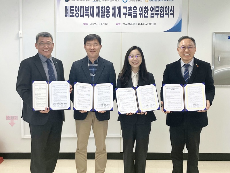 제주도는 기후에너지환경부, 한국환경공단, 농협중앙회 제주본부와 함께 ‘폐토양피복재 재활용 체계 구축을 위한 업무협약’을 19일 한국환경공단 제주지사에서 체결했다.