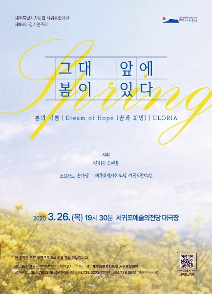 ‘그대 앞에 봄이 있다’라는 부제로 열리는 이번 정기연주회는 도립서귀포합창단의 2026년도 첫 정기연주회로 ‘봄의 기쁨’, ‘꿈과 희망’, ‘글로리아’ 세 개의 주제로 구성되어 봄의 아름다움을 풍성한 합창으로 그려낸다.