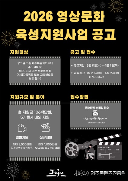 제주콘텐츠진흥원이 제주 지역 영상문화 활성화를 위해 ‘2026 영상문화 육성지원사업’ 참여 단체를 오는 4월 9일까지 모집한다.