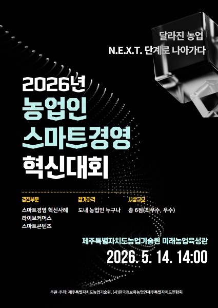 제주도 농업기술원이 디지털 마케팅 등 정보화 우수사례를 발굴하고 농업·농촌 현장의 스마트화 확산을 위해 ‘2026년 농업인 스마트경영 혁신대회’ 참가자를 오는 30일까지 공개 모집한다.