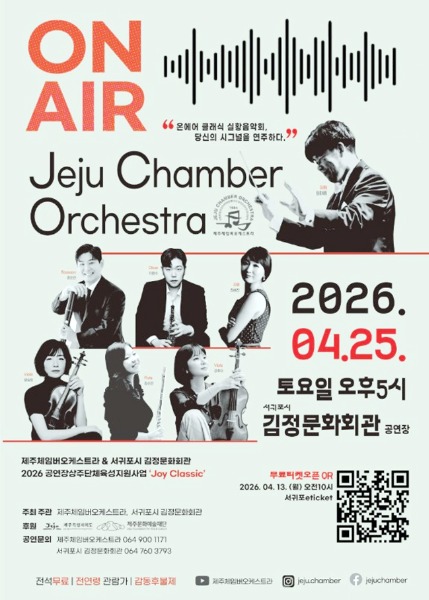 제주 서귀포시가 2026년 공연장 상주단체 육성지원 사업의 일환으로 제주체임버오케스트라의 공연 ‘온 에어’를 오는 25일 오후 5시 김정문화회관에서 개최한다.