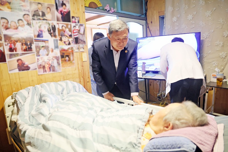 김완근 제주시장이 15일, 의료·요양·돌봄 통합지원사업의 운영 실태를 점검하고 현장의 목소리를 듣기 위해 재택의료센터 대상가구를 방문했다.