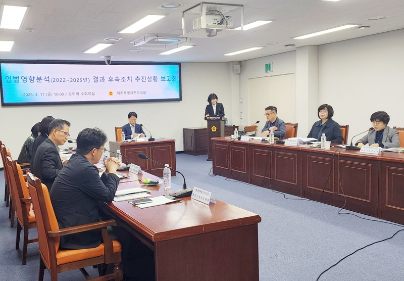 제주도의회가 17일 오전 도의회 소회의실에서 ‘입법영향분석(2022~2025년) 결과 후속조치 추진상황 보고회’를 개최했다.