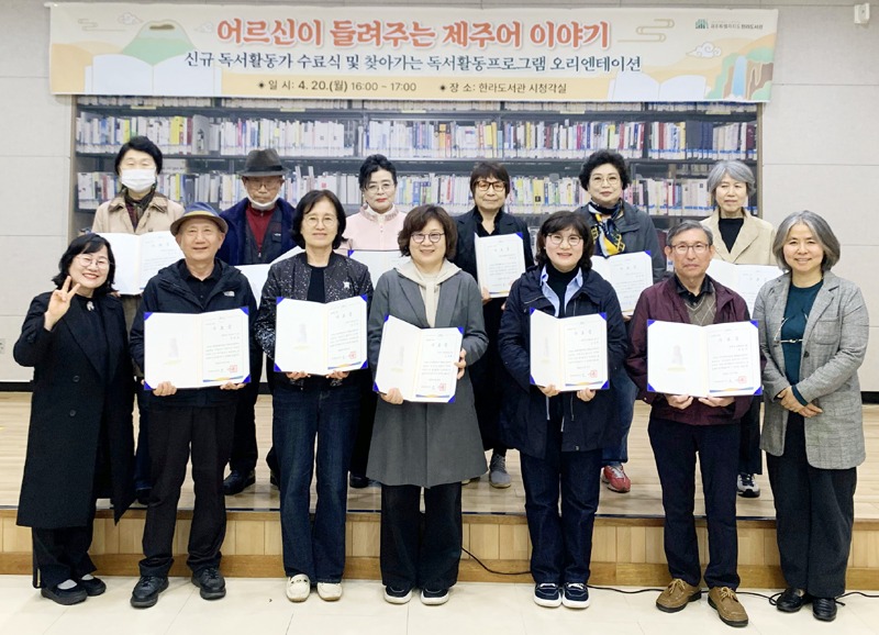 제주 어르신들이 직접 제주어 동화구연가로 나선다. 한라도서관이 지난 20일 도서관 강의실에서 올해 ‘어르신이 들려주는 제주어 이야기’ 신규 활동가 양성과정 수료식을 열었다.