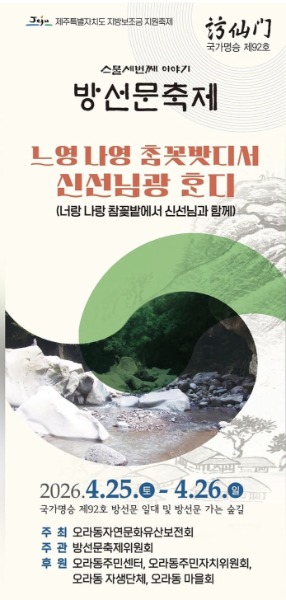 제주지역의 무사안녕 행복기원제와 도민이 함께 어우러지는 축제의 장을 통해 일상의 어려움을 함께 극복하고 지역 화합을 다지는 자리인 ‘제23회 방선문 축제’가 오는 25일부터 26일까지 제주시 오라동 방선문 일대에서 개최된다.