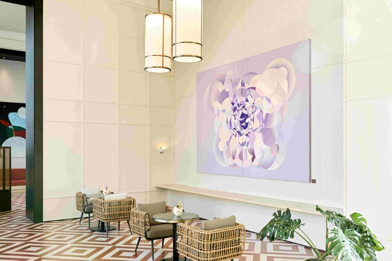 양순열 작가의 전시 ‘웜스 인 블룸(Warmth in Bloom): 사랑’은 그랜드 조선 제주 힐 스위트관 웰컴 로비, 1층 그랑 제이, 본관 로비 등 호텔 곳곳에서 총 26점의 작품으로 구성되며, 8월 30일까지 투숙객이라면 누구나 관람 가능하다.