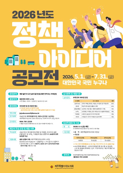 제주도의회, ‘2026 정책아이디어 공모전’ 개최... 5월 1일~ 7월 31일