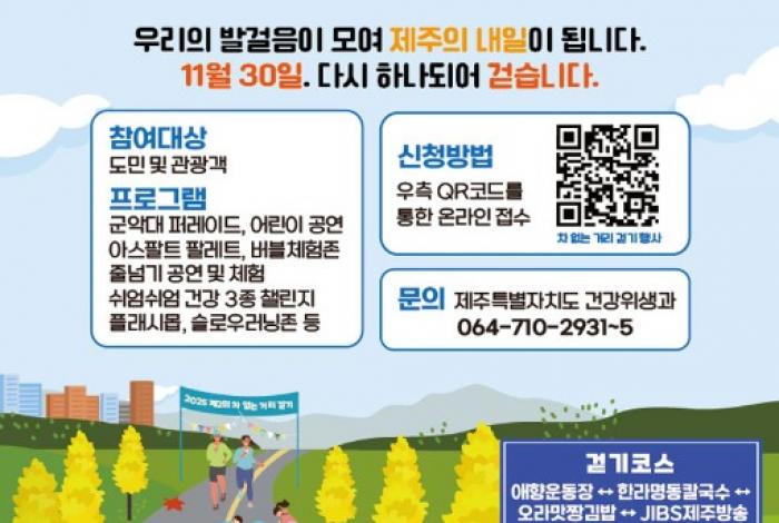 제주도는 오는 30일 개최하는 ‘제2회 차 없는 거리 걷기행사’의 참가자 사전 접수를 12일부터 시작했다.이 행사는 당일 오전 9시부터 오후 1시까지 애향운동장과 연삼로 일대에서 진행된다. 사전 접수는 28일까지 제주도청과 제주관광공사 누리집, 공식 ...