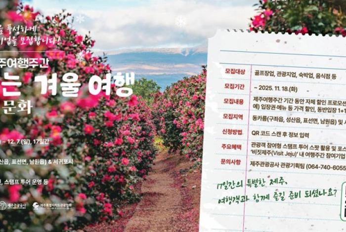 제주관광공사가 다가오는 겨울을 맞아 오는 21일부터 12월 7일까지 17일간 ‘머무는 겨울 여행, 자연&문화’를 주제로 제주 여행주간을 운영하는 가운데 제주 동카름(구좌·성산·표선·남원) 지역과 서귀포시내 참여기업을 오는 18일까지 모집하고 있...