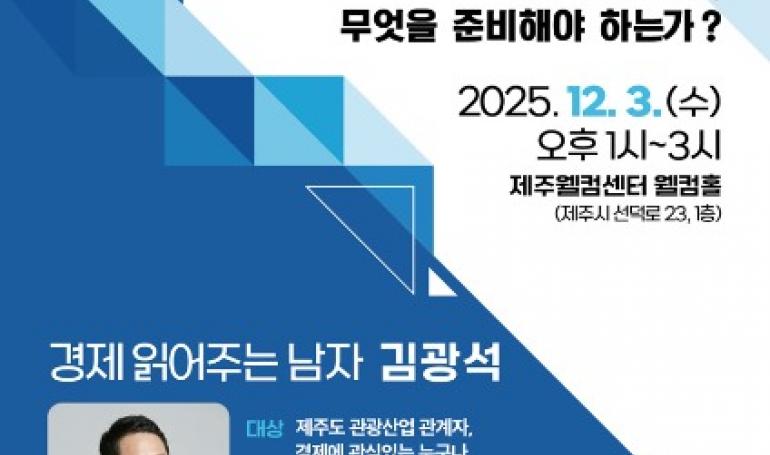 제주관광공사가 ‘경제 읽어주는 남자’로 유명한 김광석 한양대학교 겸임교수를 초청, 오는 12월 3일 제주웰컴센터에서 ‘2026년 경제 전망과 대응 전략 : 제주 관광산업, 무엇을 준비해야 하는가?’를 주제로 특강을 진행한다고 14일 밝혔다.김광석 교수는 어렵다고 생각되...