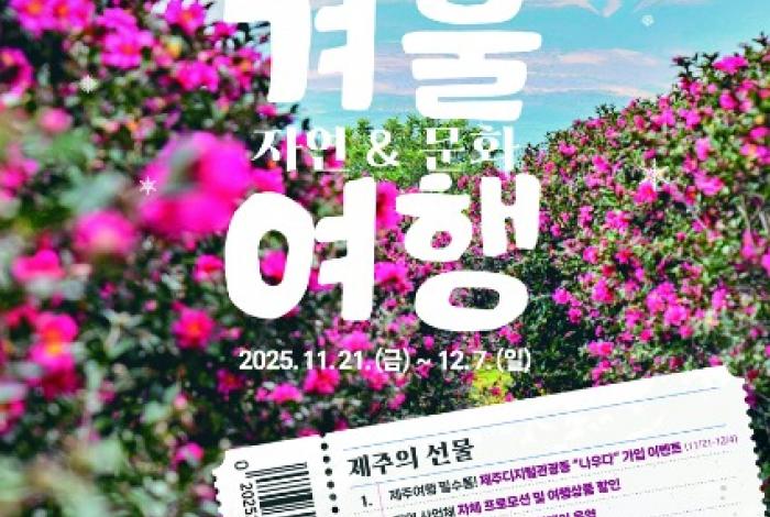제주특별자치도가 오는 21일부터 다음달 7일까지 17일간 겨울의 정취를 담은 ‘2025 지금, 제주여행-겨울시즌’을 운영한다.관광지가 아닌 마을을 여행의 중심으로 삼아, 지역데이 프로그램과 디지털 스탬프 투어, 무료 시티투어 등을 통해 겨울 제주의 일...