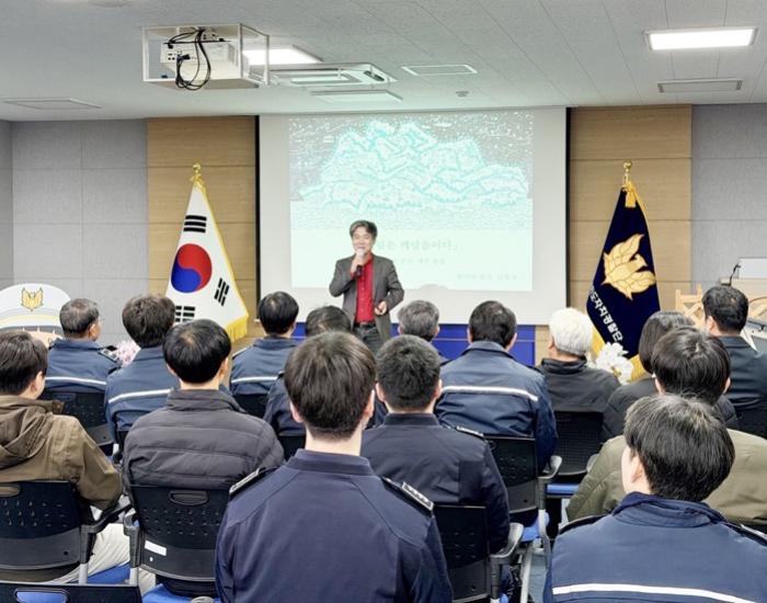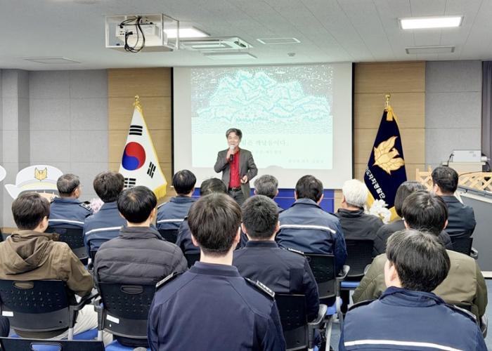 ▲ 제주특별자치도 자치경찰단이 지난 20일 한국의 화가 김품창 화백을 초청해 ‘그림은 깨달음이다’라는 주제로 인문학 강연을 실시했다. 다소 낯선 인문학 강연을 화가 본인이...
