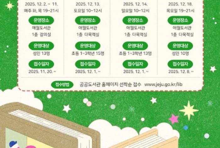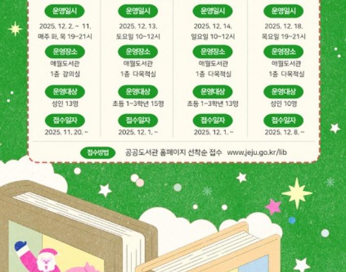 제주 애월도서관이 동절기를 맞아 지역 주민들이 따뜻하고 풍요로운 연말을 보낼 수 있도록 오는 12월 2일부터 18일까지 ‘도서관에서 메리북스마스!’ 연말 특별 프로그램을 운영한다.이번 프로그램은 성인과 어린이 모두가 함께 즐길 수 있도록 구성되어 지역...