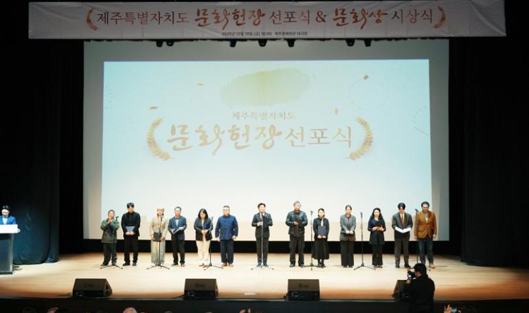 제주특별자치도가 지난 6개월간의 도민 참여 논의 과정을 거쳐 ‘제주특별자치도 문화헌장’을 선포했다.문화헌장은 올해 5월부터 10월까지 도민과 전문가 138명이 문화자치 원탁회의에 참여해 제주 문화정책의 실천 방향을 함께 만들었다.▲ 19일 문예회관 대극장에서 ‘문화헌...