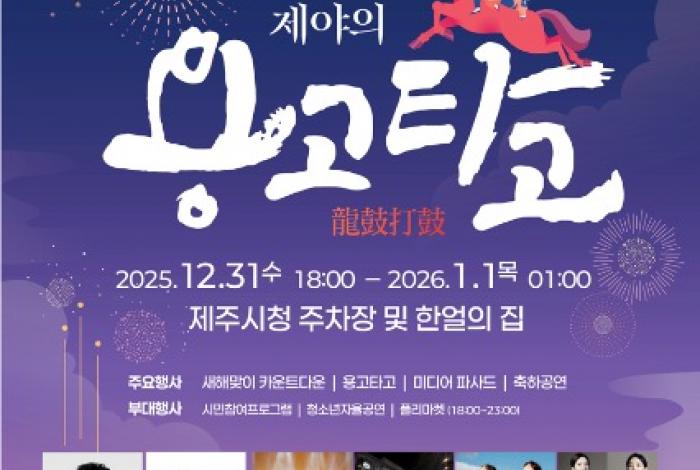 제주시가 2025년을 마무리하고 2026년 병오년(丙午年) 붉은 말의 해를 맞아, 제주시민의 무사 안녕을 기원하는 ‘제야의 용고타고’ 행사를 오는 31일 밤 10시 제주시청에서 개최한다.이날 행사는 오후 6시부터 부대행사를 시작으로 본 행사는 밤 10...