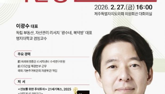 제주도의회가 오는 27일 대회의실에서 ‘2월 공감·소통의 날’ 행사를 개최한다.이번 행사는 ‘새로운 시대, 모두를 위한 경제와 투자’가 주제인데 고물가·고금리 여파로 어려움을 겪고 있는 도민들의 현실을 함께 공감하고, 급변하는 국내·외 경제 환경 속에서 실질적인 경제 상식과 자산 관리 전략을 공유하기 위해 마련됐다.▲ 제주도의회의 이광수 대표 특별강연 포스터강연은 부동산 경제 전문가 이광수 대표가 나선다. 이 대표는 GS건설 재경본부, 미래에셋증권 리서치센터 수석연구위원을 거쳐 현재 독립 리서치 ‘광수네 복덕방' 대표 및 명지대학교...