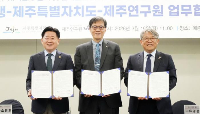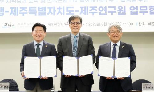 제주도가 한국은행, 제주연구원과 함께 제주 경제구조 정밀 분석과 디지털화폐(CBDC)·예금토큰 공공 활용을 모색하는 협력체계를 본격 가동한다.제주도는 16일 메종글래드 제주에서 한국은행, 제주연구원과 ‘제주 지역경제 분석과 한국은행 디지털화폐·예금토큰 분야 협력’을 위한 업무협약을 체결했다.▲ 16일 메종글래드 제주에서 (왼쪽부터) 오영훈 지사, 이창용 한국은행 총재, 유영봉 제주연구원장이 ‘제주 지역경제 분석과 한국은행 디지털화폐·예금토큰 분야 협력’을 위한 업무협약을 체결하고 기념촬영을 하고 있다.이날 협약식에...
