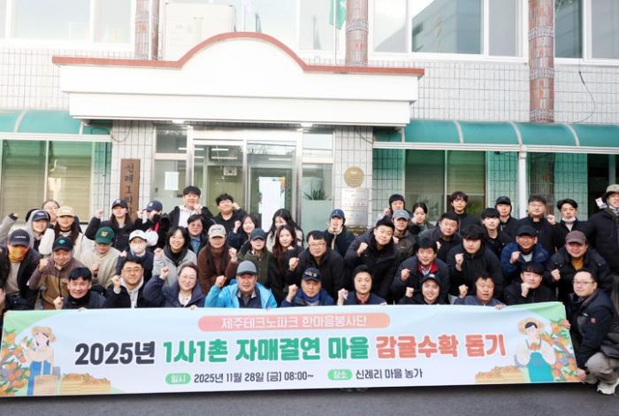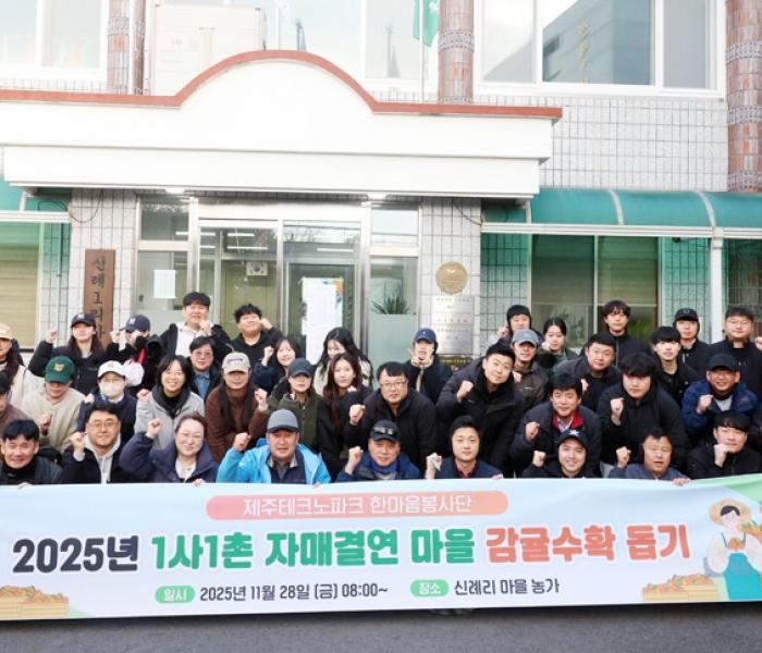 제주테크노파크가 지난 28일 서귀포시 남원읍 신례1리(이장 양택균)에서 '1사1촌 감귤수확 일손돕기' 봉사활동을 펼쳤다.이날 봉사활동에는 지영흔 원장을 비롯한 제주테크노파크 임직원 60명이 참여했다. 봉사자들은 오전 8시부터 10여 농가 감귤원에서 감...