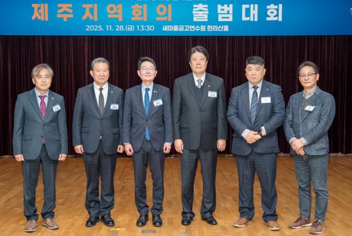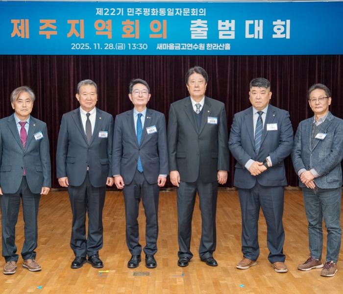 ▲ ‘제22기 민주평화통일자문회의 제주지역회의’ 출범대회 참석자들이 통일퍼포먼스를 벌이고 있다.민주평화통일자문회의 제주지역회의(부의장 양문석)가 지난 28일, MG새마을금고 제주연수원에서 ‘제22기 민주평화통일자문회의 제주지역회의’ 출범대회를...