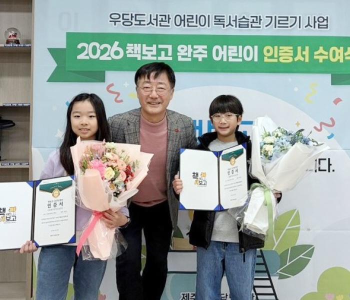 제주시 우당도서관이 어린이 독서습관 기르기 사업인 ‘책보고’ 도서대출서비스의 첫 완주자가 탄생함에 따라 지난 29일 완주 어린이 인증서 수여식을 개최했다.첫 완주자는 책보고 1단계 참여 어린이로 삼화초등학교 2학년 고지욱, 신광초등학교 2학년 김은서 어린이다. 이들 두