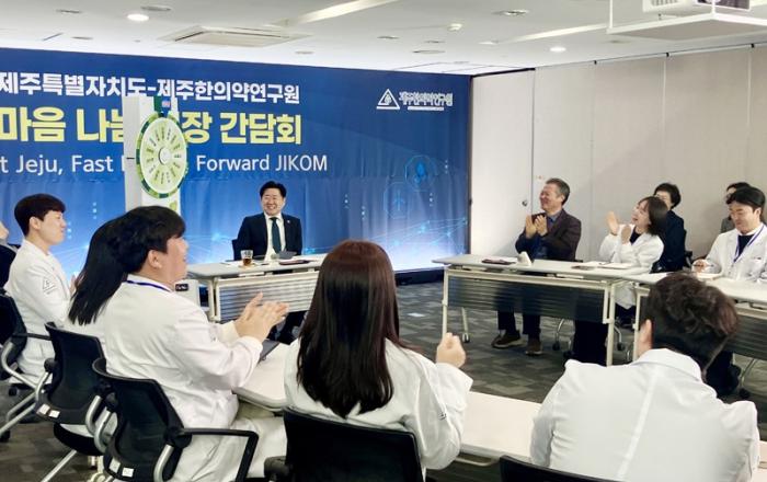 제주한의약연구원(원장 송민호)가 지난 6일 JDC 스마트빌딩에서 오영훈 지사와 임직원이 함께하는 ‘마음 나눔 간담회’를 개최했다.이번 간담회는 제주도와 제주한의약연구원 간 현장 중심의 소통을 강화하고, 연구원 주요 사업과 제주 한의약 산업 발전 방향에 대해 의견을 나누