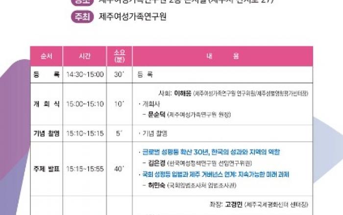 제주여성가족연구원이 오는 25일 오후, 연구원 2층 온지실에서 ‘지속가능한 미래와 성평등 제주’를 주제로 ‘제35회 제주여성가족정책포럼’을 개최한다.이번 포럼은 제주여성가족연구원 개원 12주년을 맞이해 지난 30년 동안의 성평등 확산 성과와 지역의 역할을 짚어보고, 제