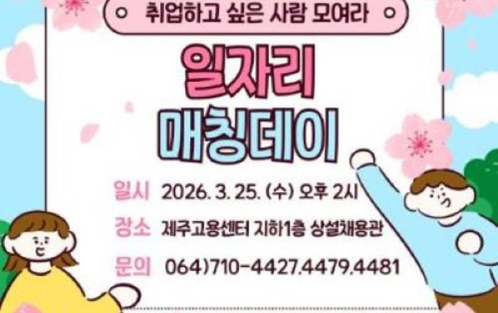 제주도가 오는 25일 오후 2시 제주고용복지플러스센터 상설채용관(지하 1층)에서 ‘일자리 매칭데이’를 개최한다.이번 행사는 고용센터, 제주여성새로일하기센터, 제주중장년내일센터, 서민금융통합지원센터, 제주자립지원전담기관 등 5개 기관이 공동 주관하며 취업난을 겪는 구직자