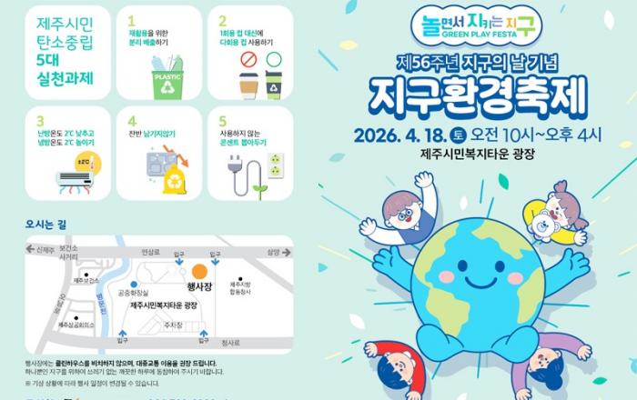 제주시가 ‘제56주년 지구의 날’을 기념해 오는 18일 제주시민복지타운 광장에서 시민들이 즐겁게 참여하고 소통할 수 있는 ‘2026 지구환경축제’를 개최한다.4월 22일은 ‘지구의 날’로 지난 1969년 미국 캘리포니아주 해상 원유 유출 사고를 계기로 제정되어 전 세계