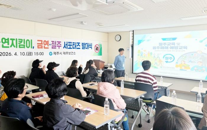 제주보건소가 지난 10일 보건교육실에서 ‘금연지킴이 및 금연·절주 서포터즈’ 발대식을 개최하고, 본격적인 활동을 시작했다.금연지킴이와 서포터즈는 대학생과 주민 70여 명으로 구성돼 지역사회 금연환경 조성과 절주문화 확산을 위한 홍보·캠페인 활동을 수행한다.▲